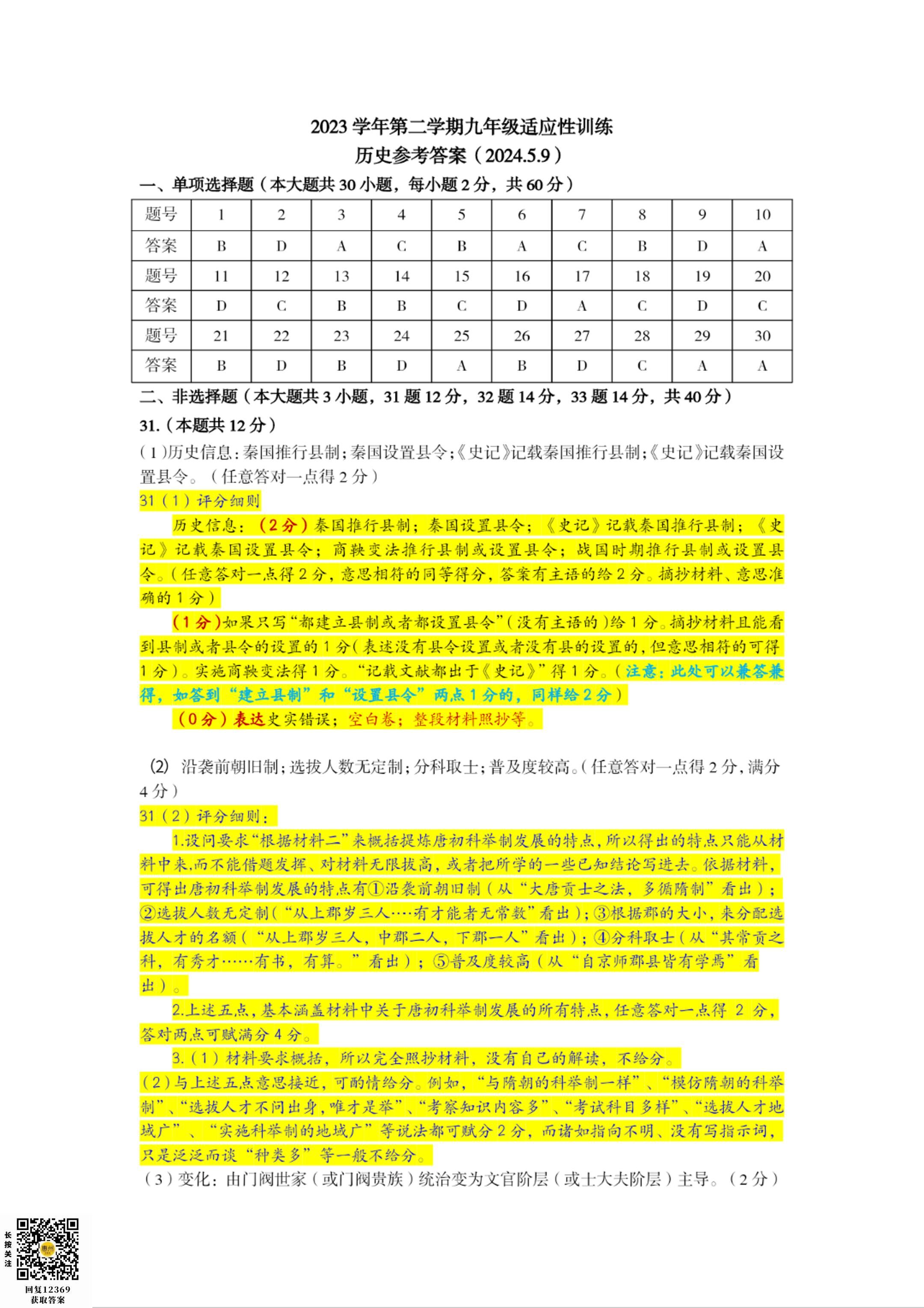 答案·07历史·2024届佛山中考·顺德区·中考二模