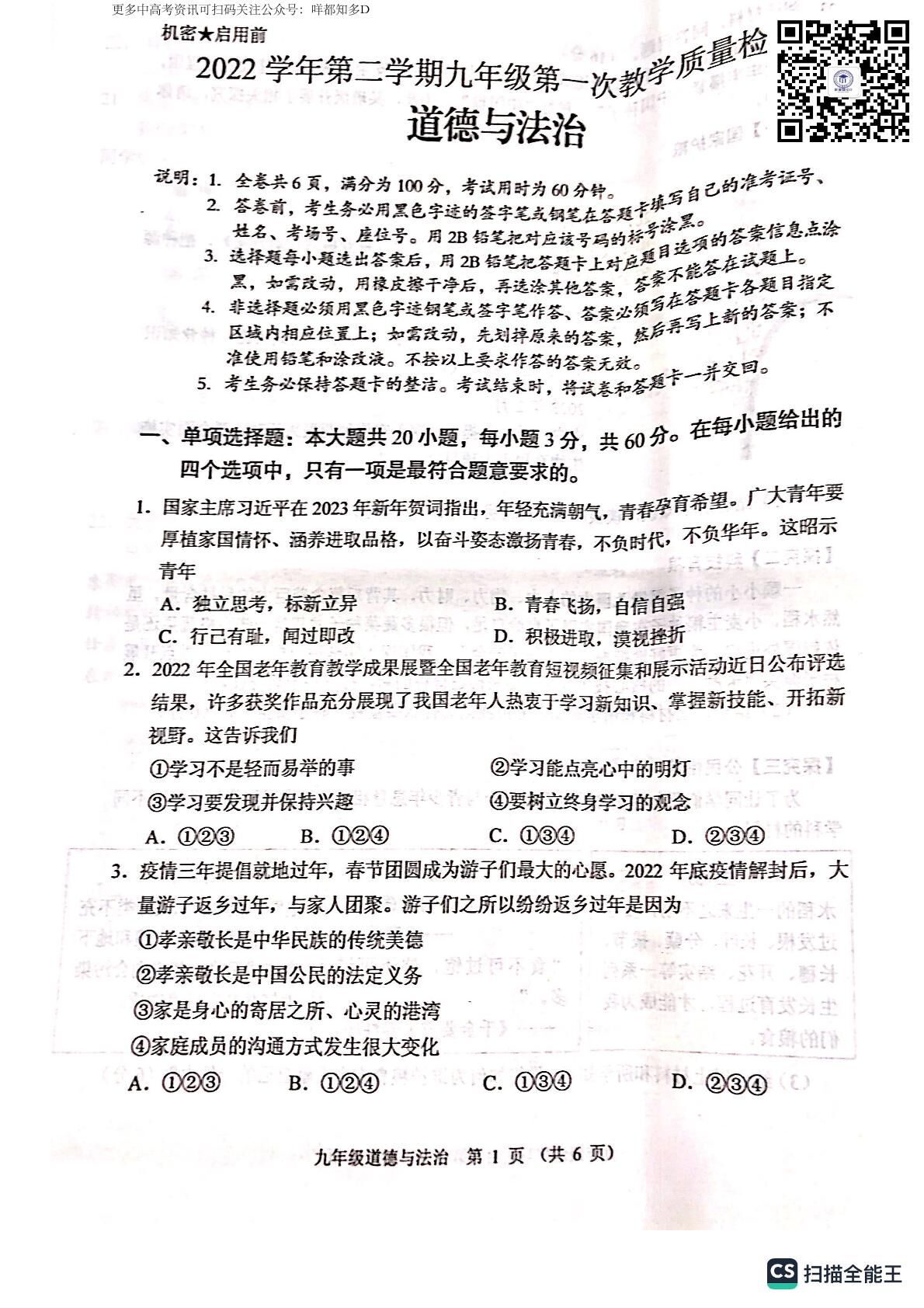2023年广东省佛山市顺德区&高明区·中考一模【政治】