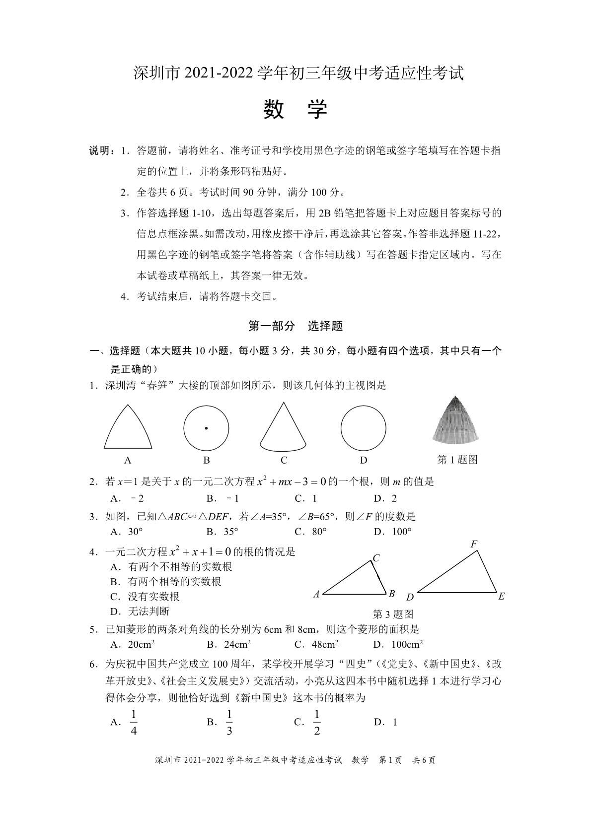 2021-2022学年深圳市初三中考适应性考试数学试卷