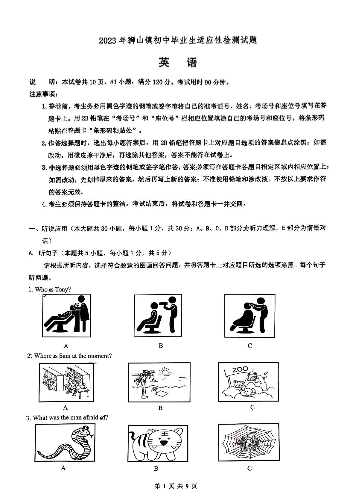 2023届初三【佛山中考一模】狮山镇统考 英语
