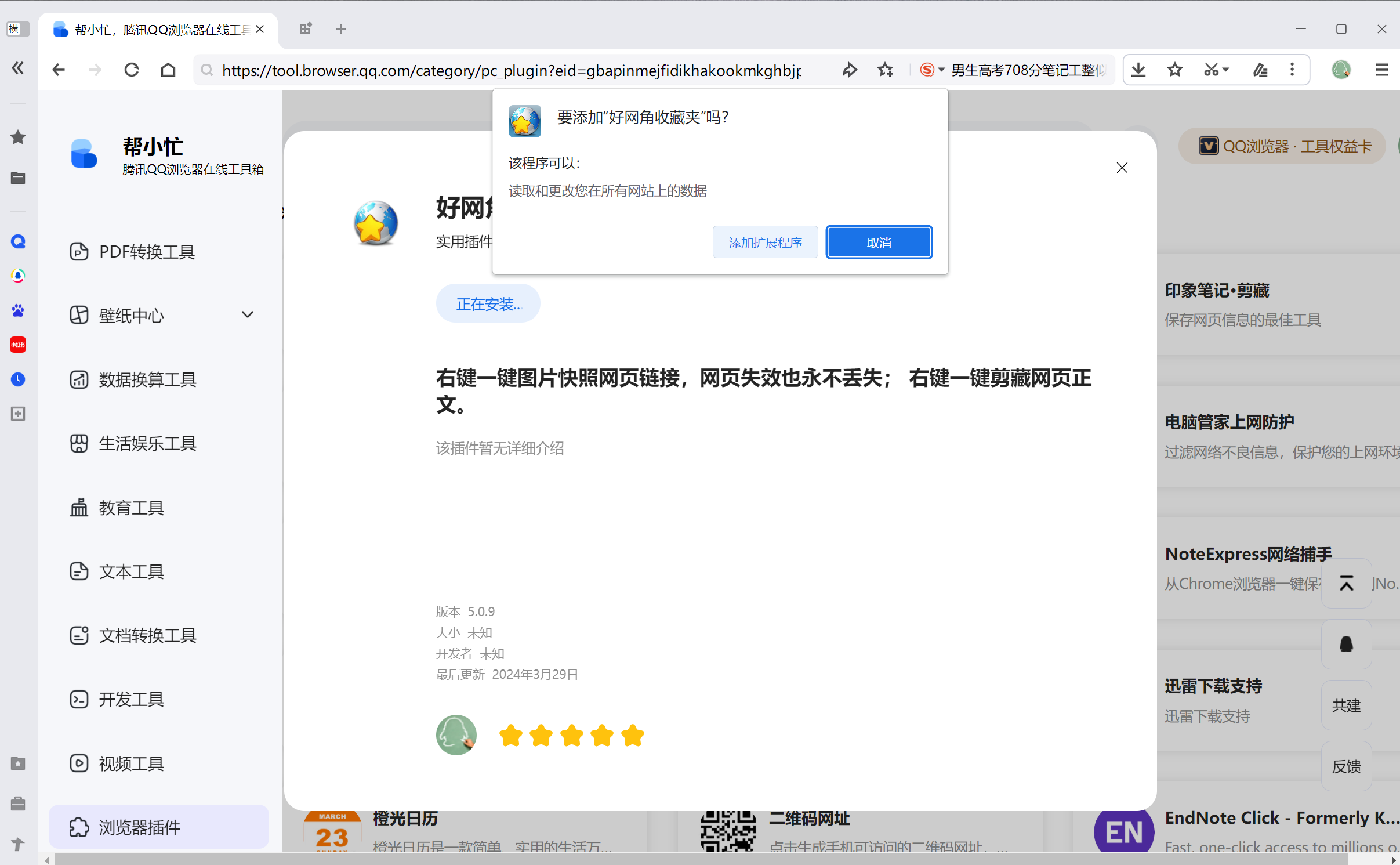 在浏览器弹出的确认窗口上,再点击“添加拓展程序”,将扩展添加到搜狗浏览器。